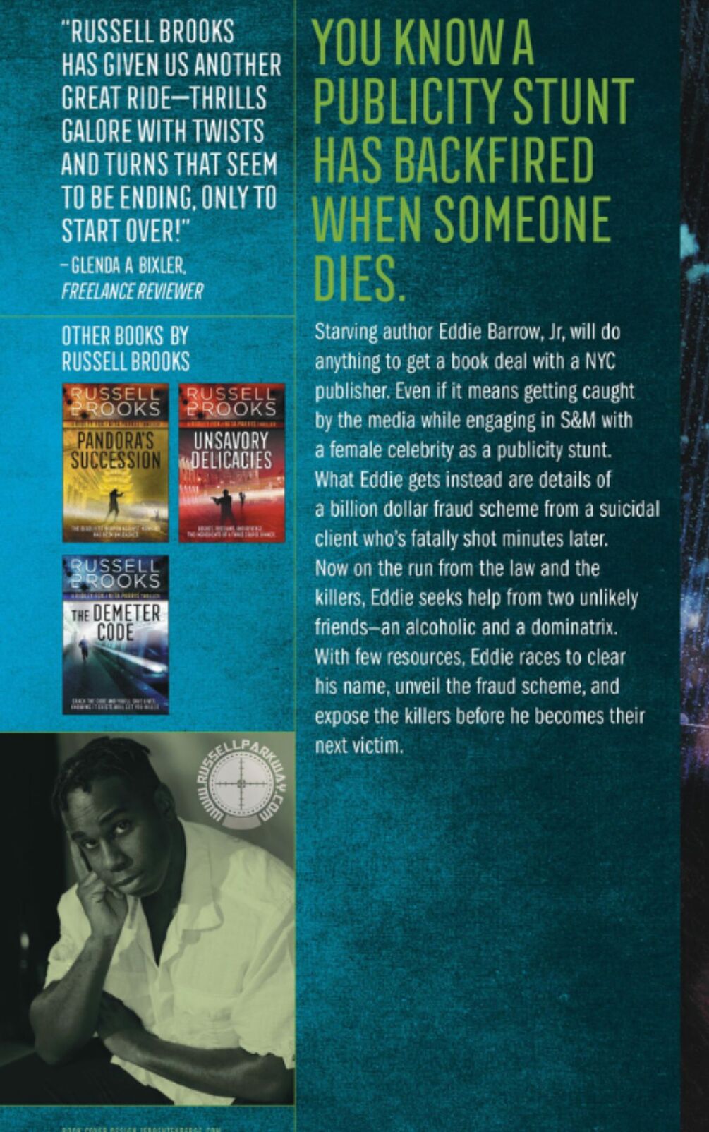 Starving author Eddie Barrow, Jr, will do anything to get a book deal with a NYC publisher. Even if it means getting caught by the media while engaging in S&M with a female celebrity as a publicity stunt. What Eddie gets instead are details of a billion dollar fraud scheme from a suicidal client who's fatally shot minutes later. Now on the run from the law and the killers, Eddie seeks help from two unlikely friends—an alcoholic and a dominatrix. With few resources, Eddie races to clear his name, unveil the fraud scheme, and expose the killers before he becomes their next victim.